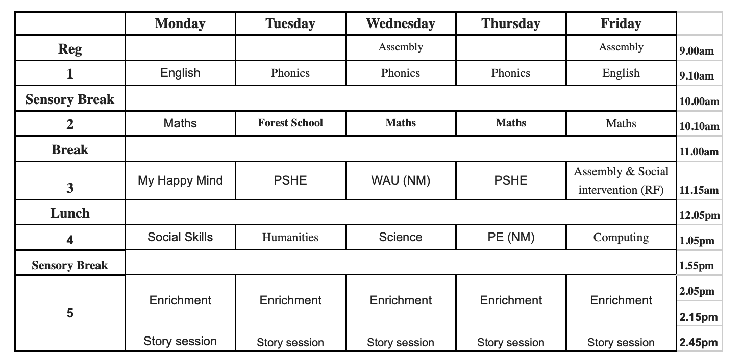 The timetable below outlines the lessons the pupils take part in each day with some examples of subjects covered and activities that take place across the year. The timetable is a visual for the pupils so they always know what to expect throughout the week.