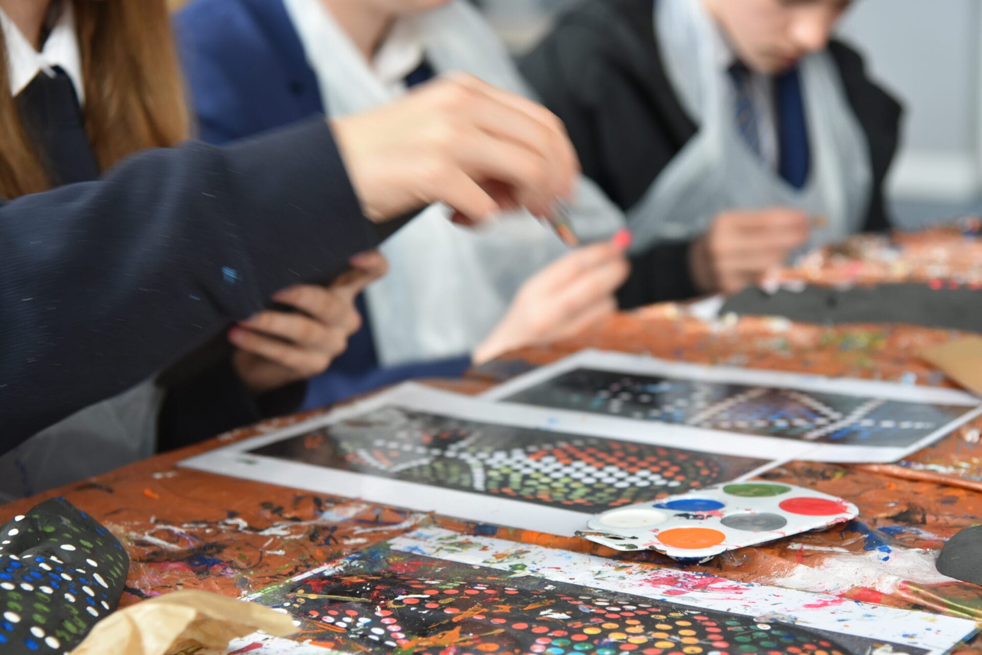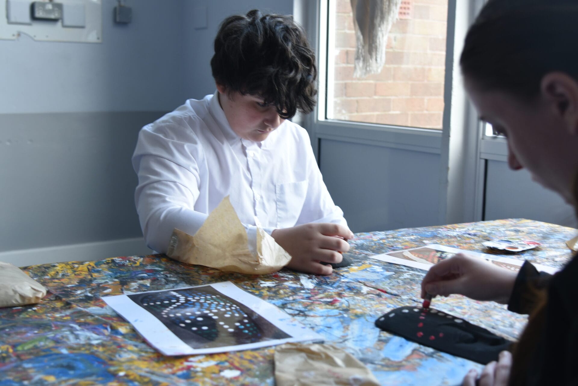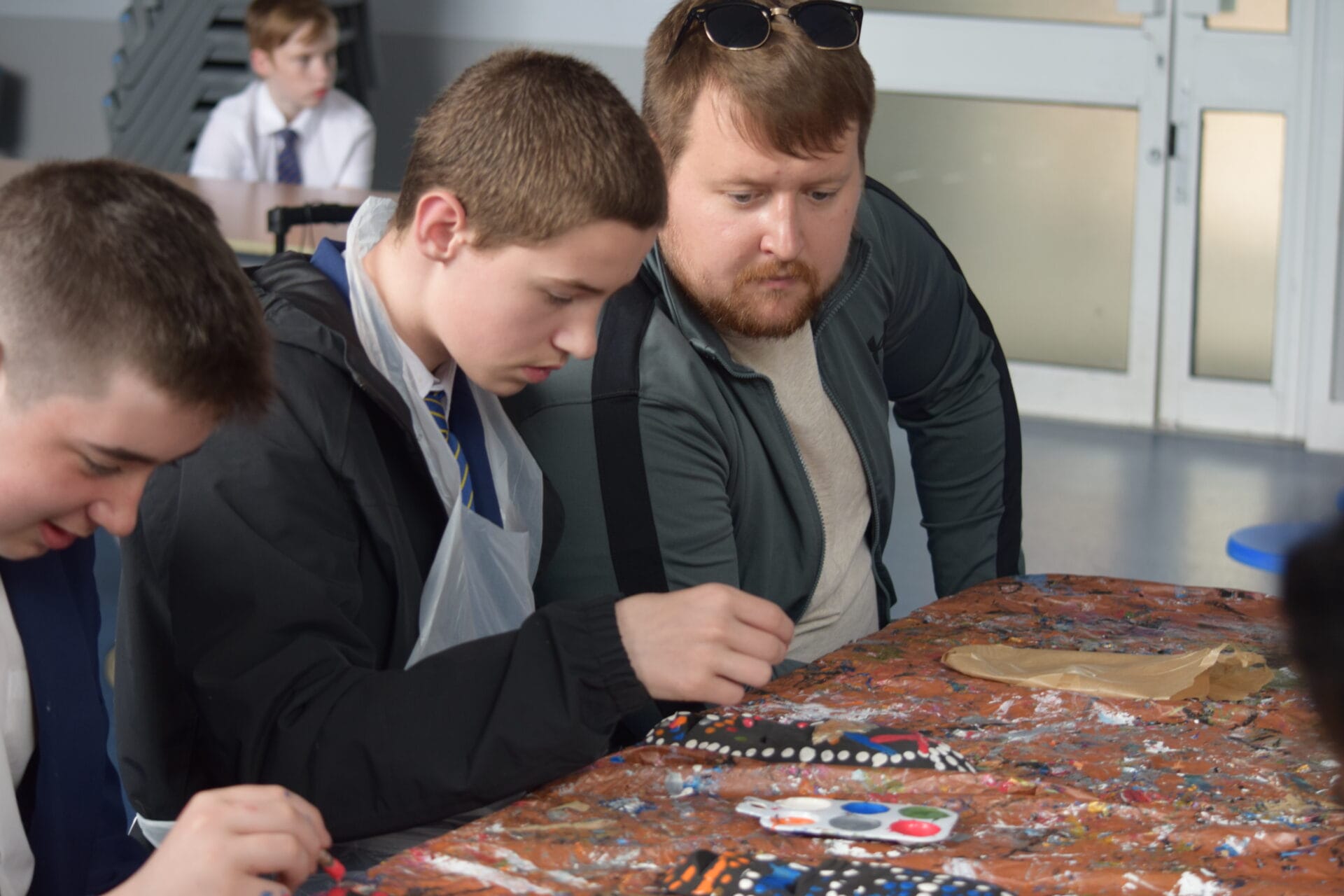 Armed with this knowledge, the pupils were eager to begin their creative journey. Tables in the hall were laden with a variety of materials: wooden masks, bright paints and brushes. The pupils, ranging from year 7 to 9, quickly immersed themselves in the task. The room buzzed with excitement and concentration as they carefully painted intricate designs on their masks, inspired by the patterns and colors they had learned about.